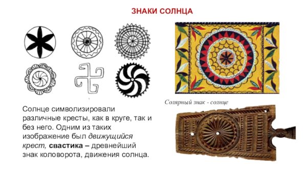Солярные знаки (солнце, земля, плодородие земли, вода).