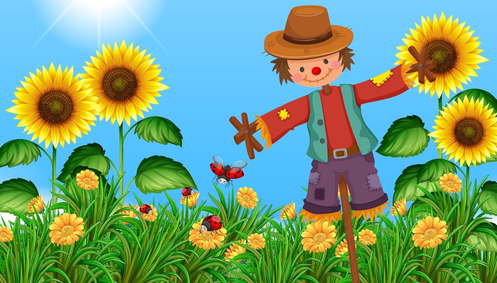 ![Пугало в поле подсолнухов]()