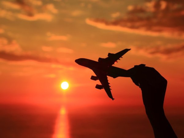 ![Силуэт самолета на закате]()