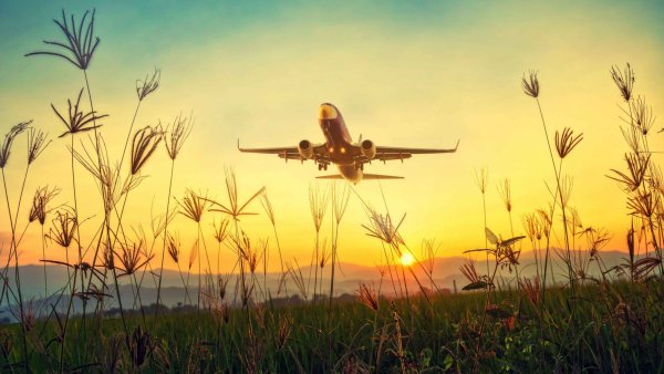 ![Самолет взлетает на закате]()