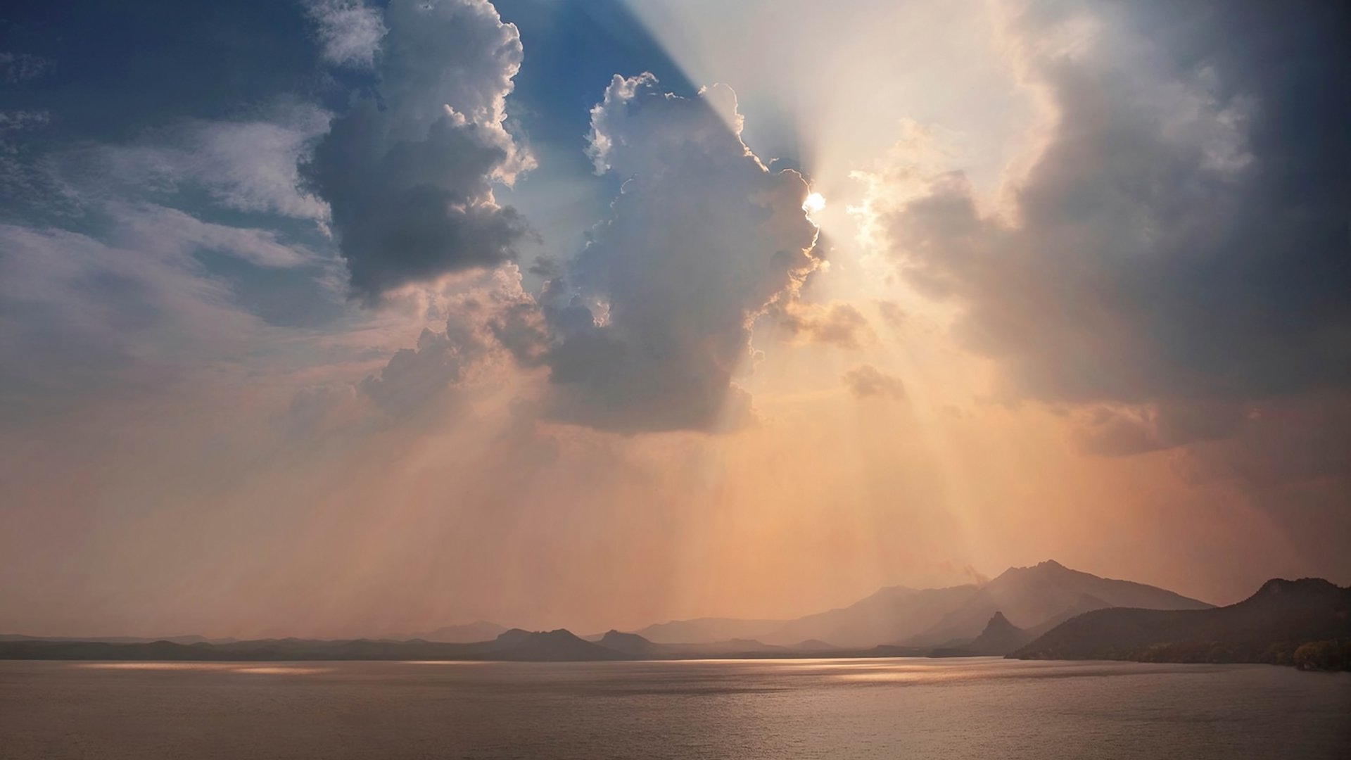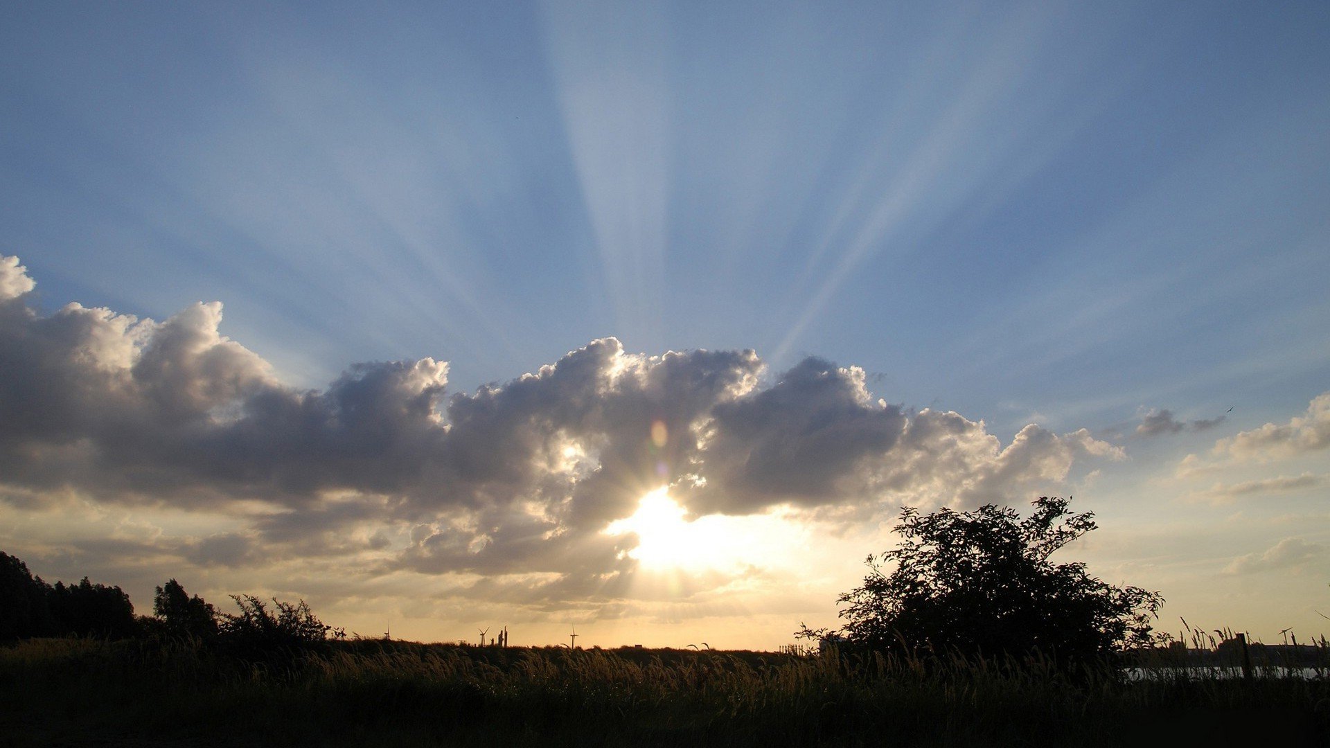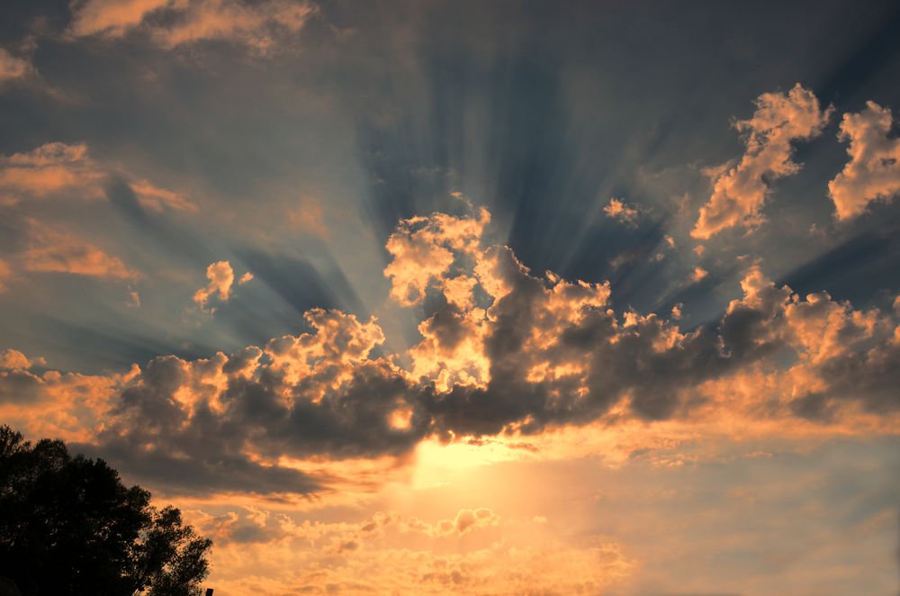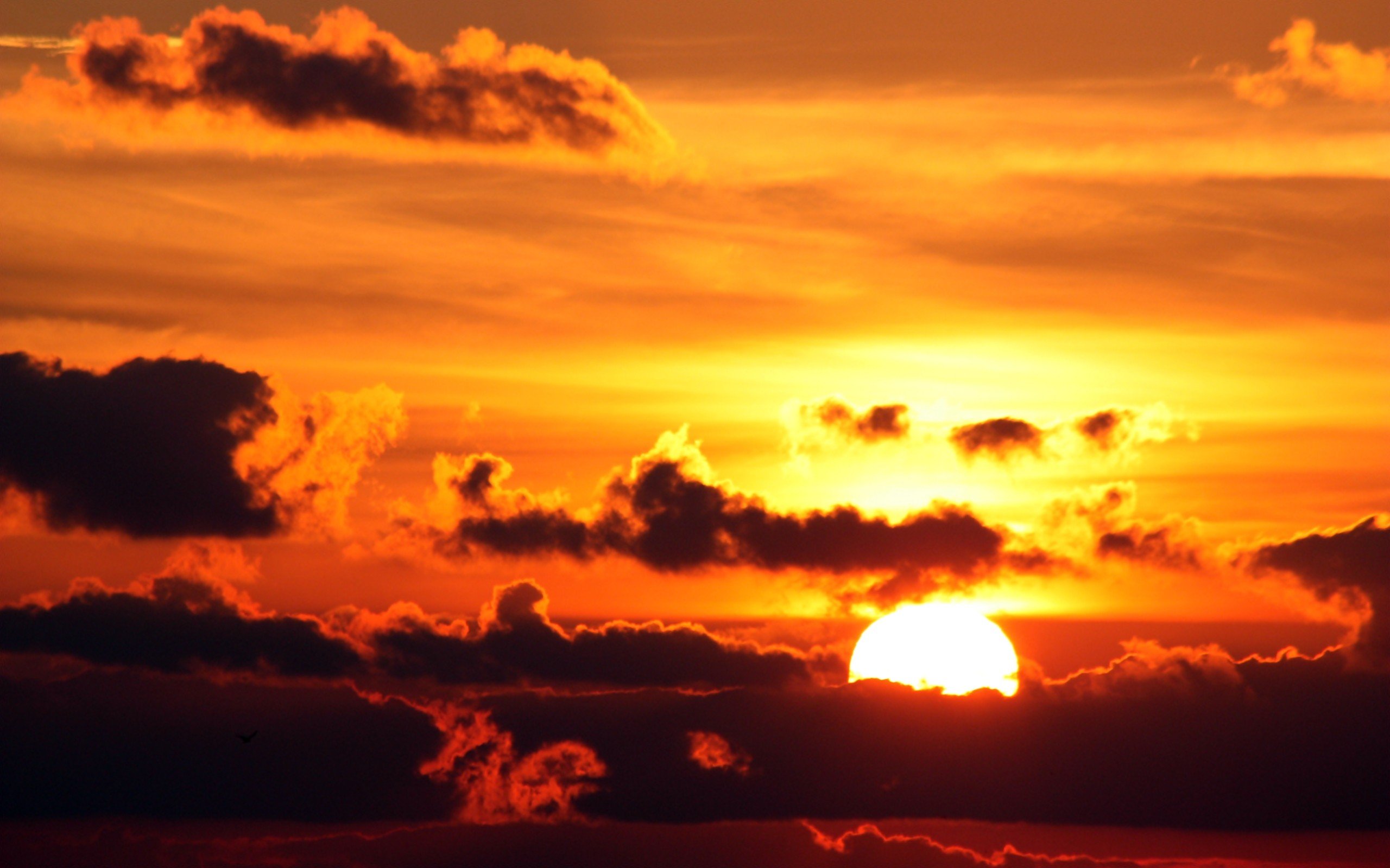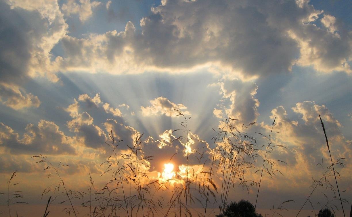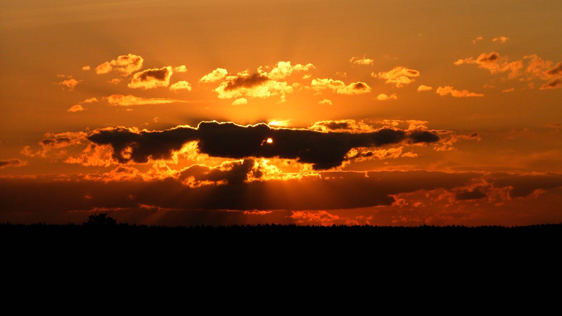 На картинке изображено великолепное солнце, медленно падающее за горизонт, окруженное пушистыми облаками. Яркие лучи проникают сквозь плотные облака, создавая игру света и тени на небесном холсте. Этот момент захватывает воображение зрителя и наполняет сердце умиротворением и восторгом перед величественной красотой заката. Вся сцена напоминает о проходящей красоте мира и природы, подчеркивая их уникальность и неповторимость.