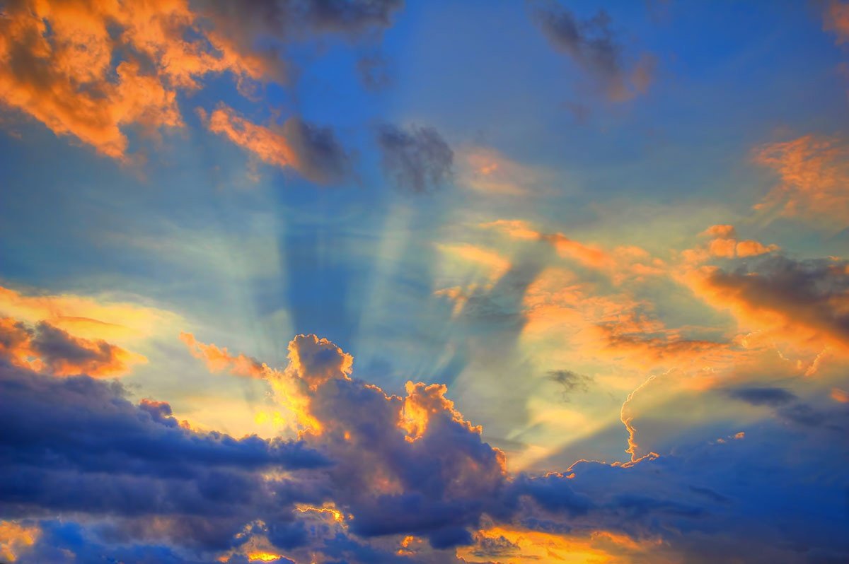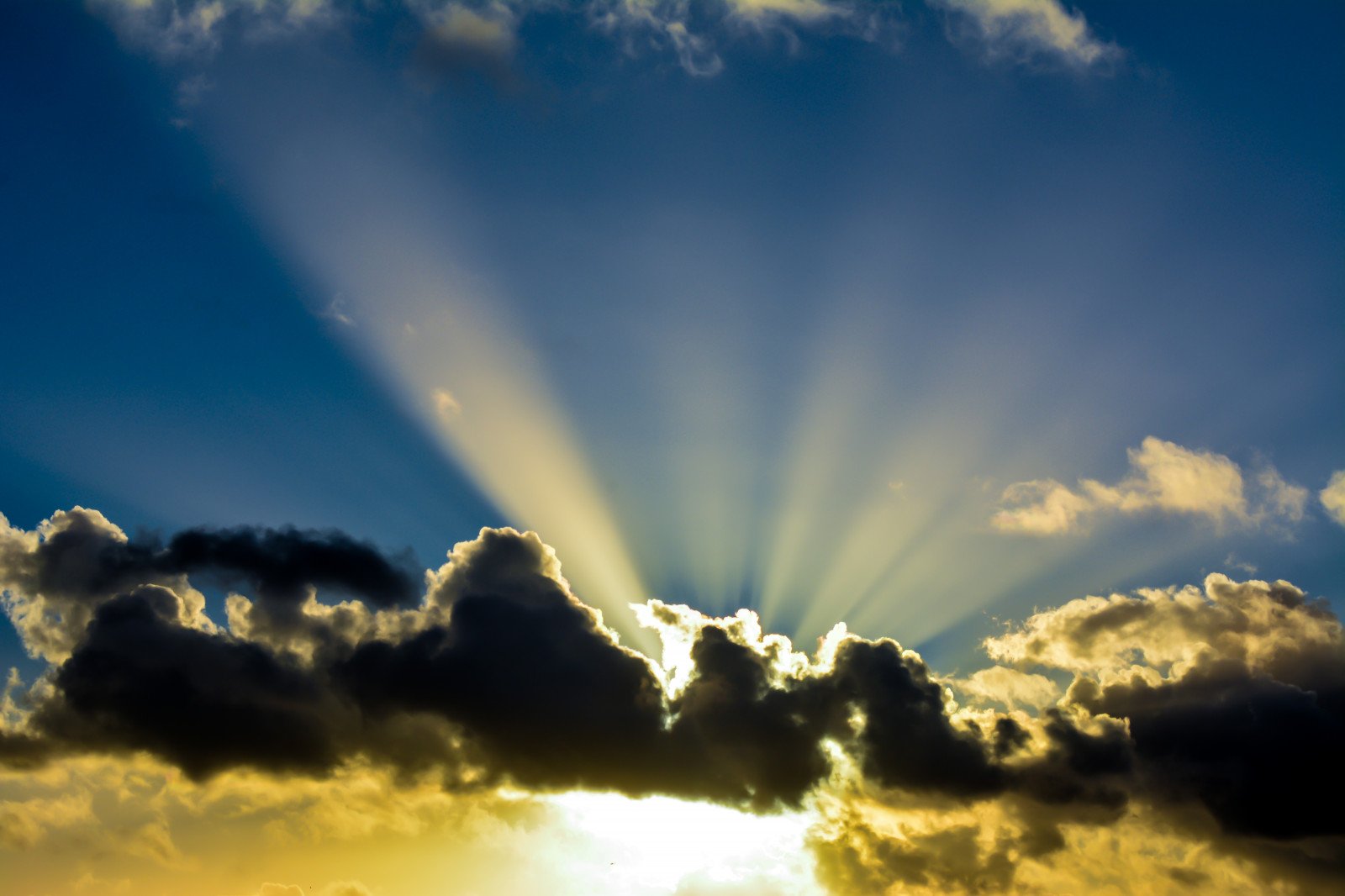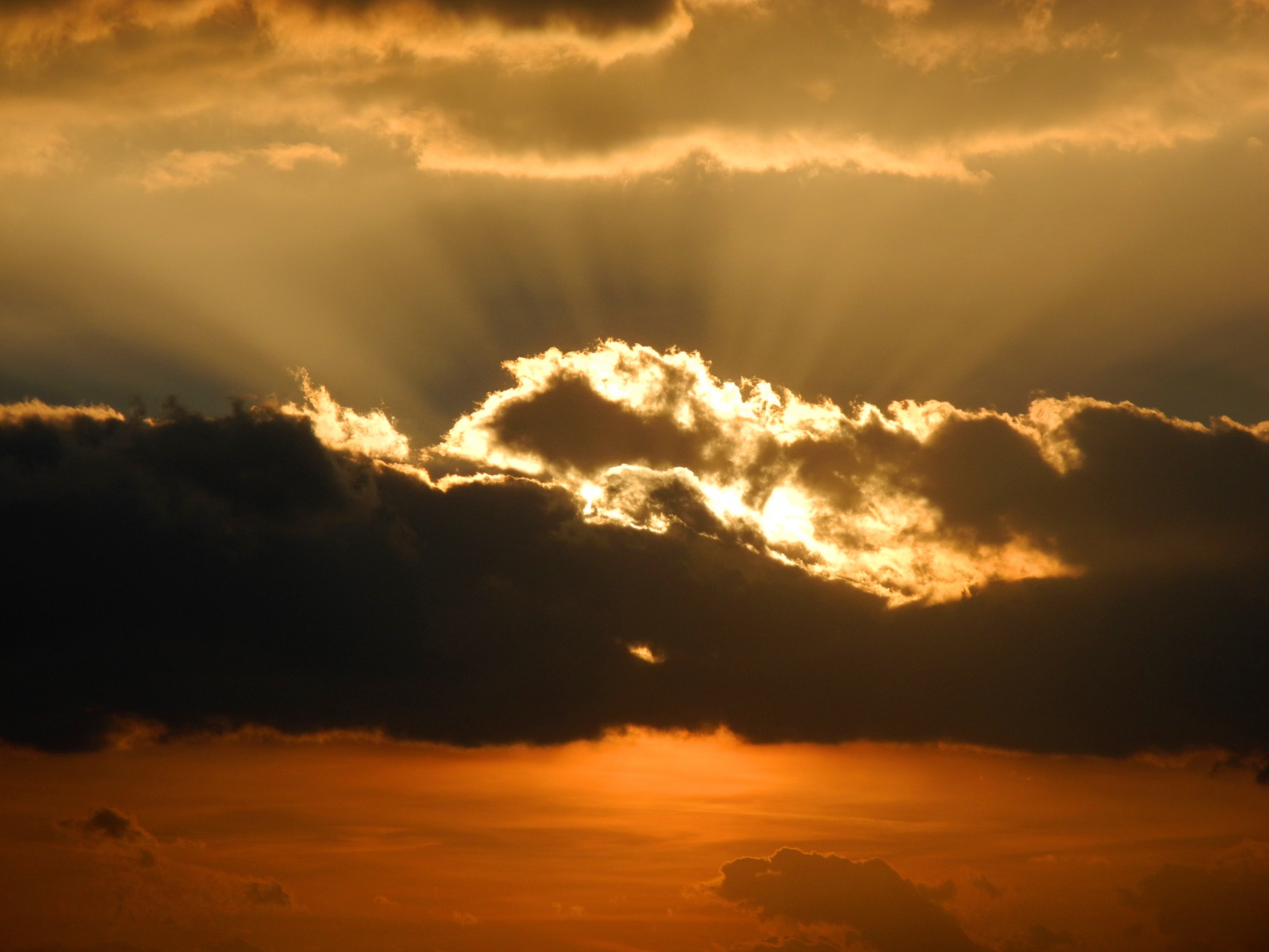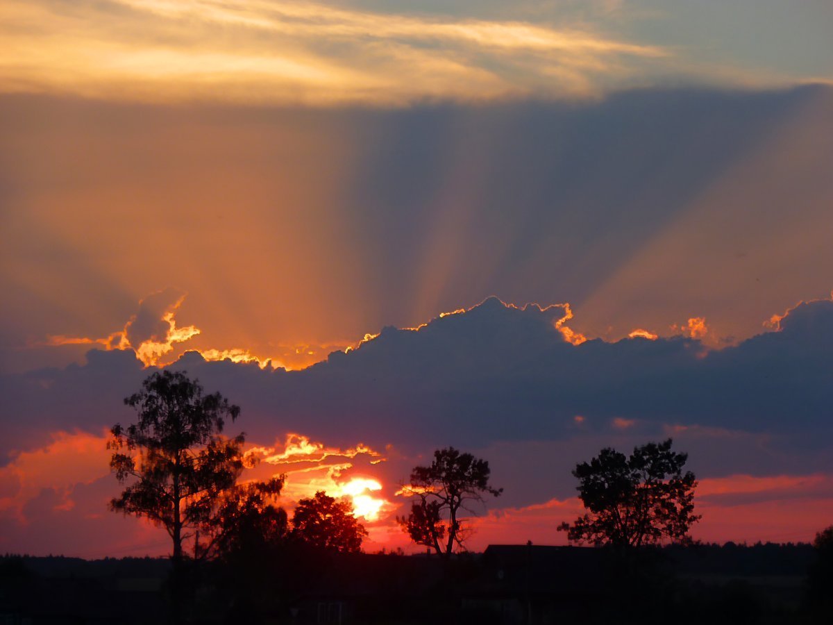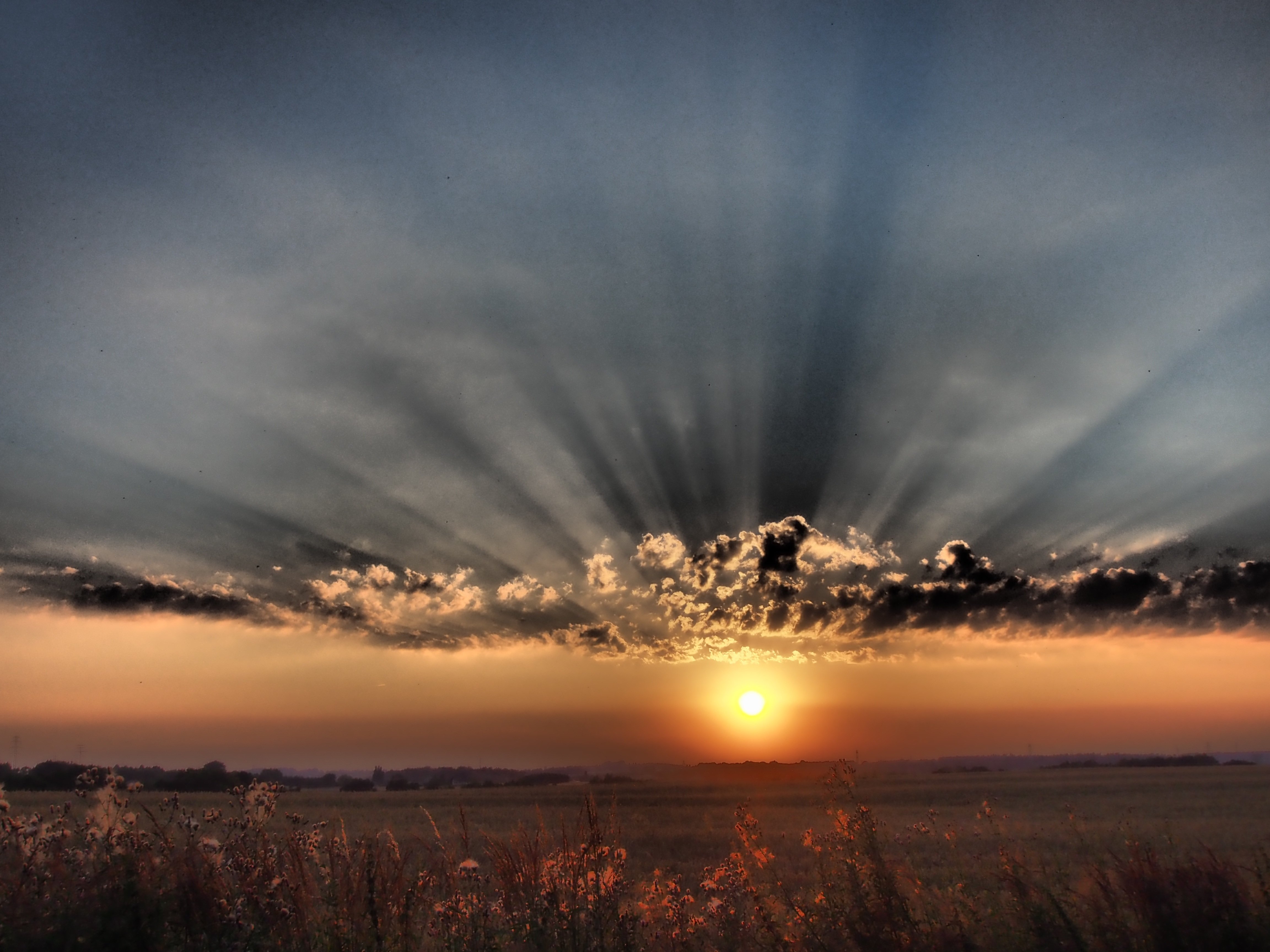 На картинке изображено великолепное солнце, медленно падающее за горизонт, окруженное пушистыми облаками. Яркие лучи проникают сквозь плотные облака, создавая игру света и тени на небесном холсте. Этот момент захватывает воображение зрителя и наполняет сердце умиротворением и восторгом перед величественной красотой заката. Вся сцена напоминает о проходящей красоте мира и природы, подчеркивая их уникальность и неповторимость.