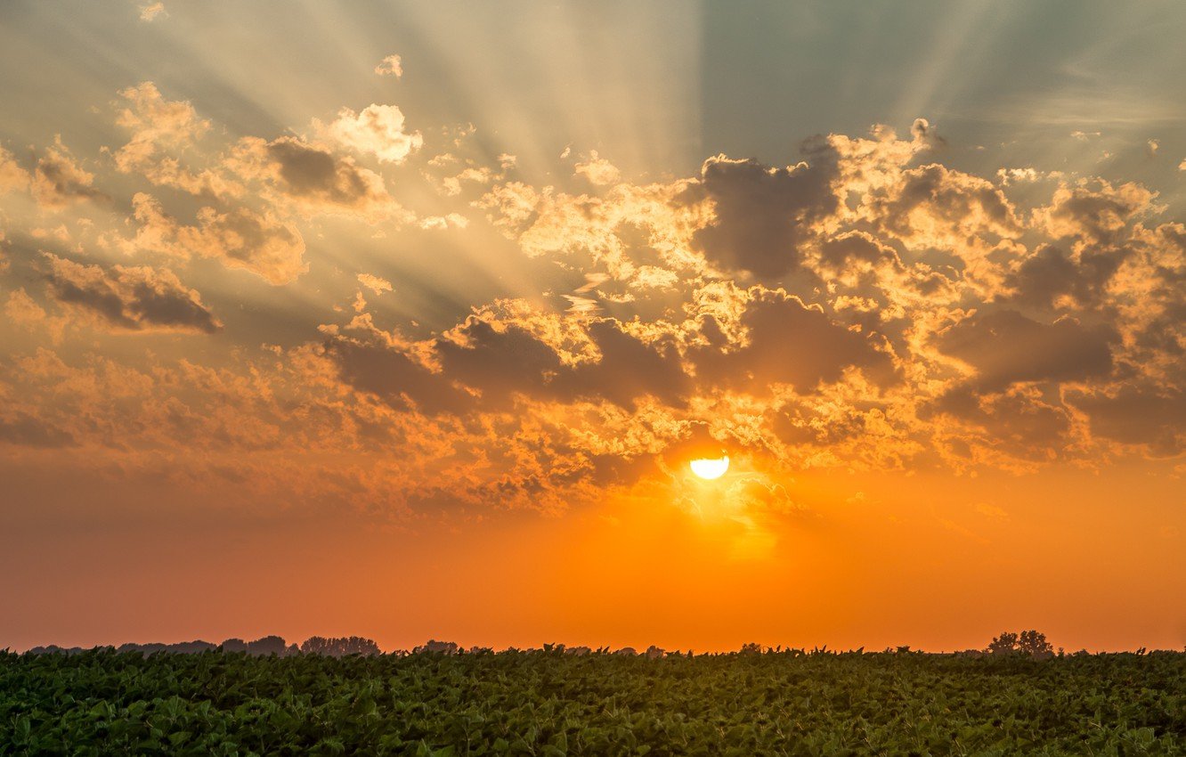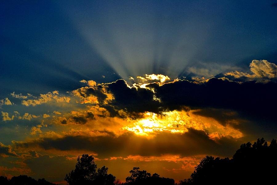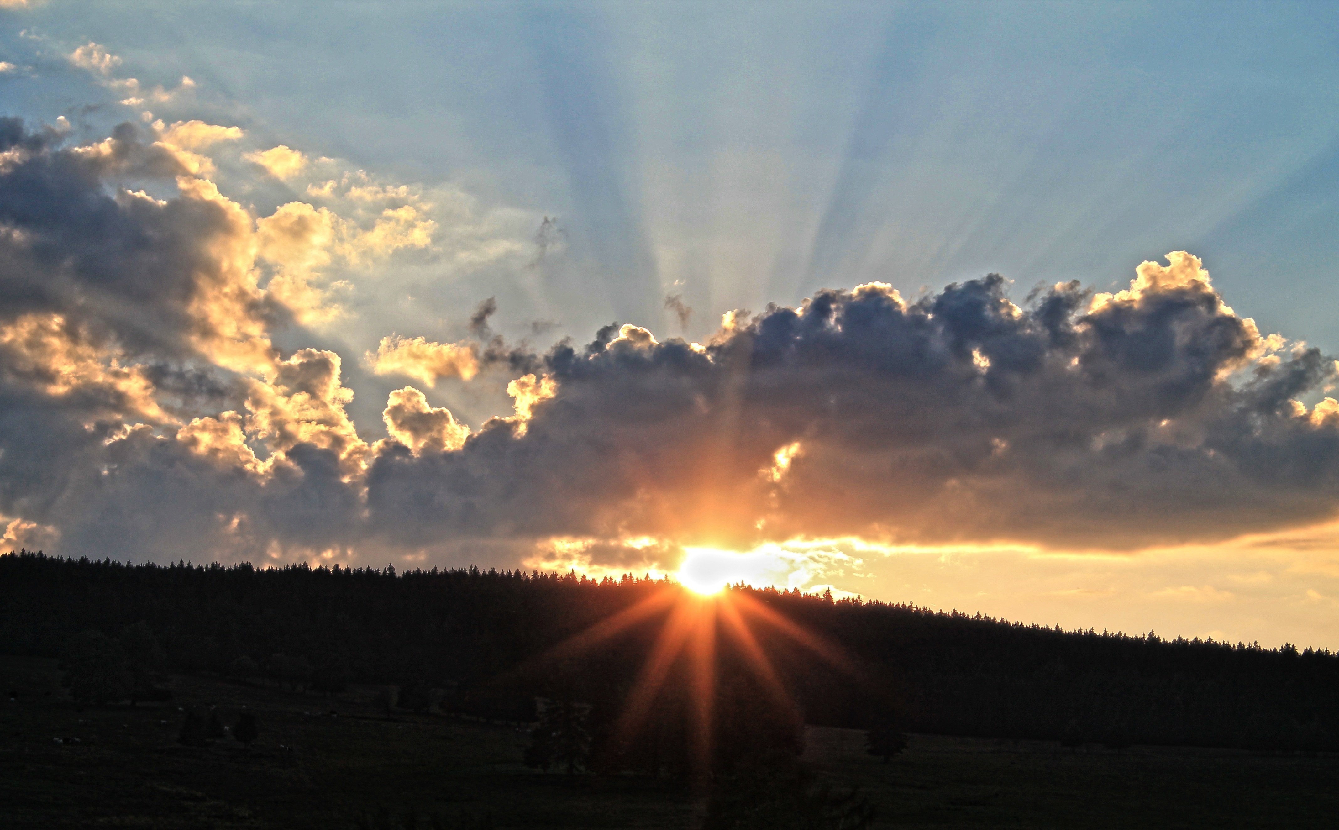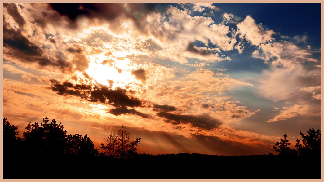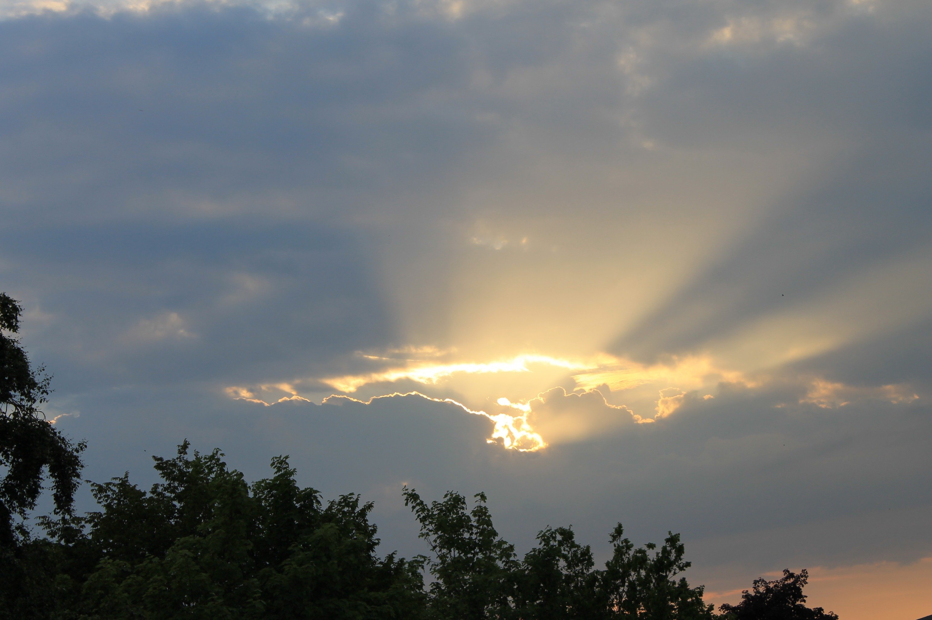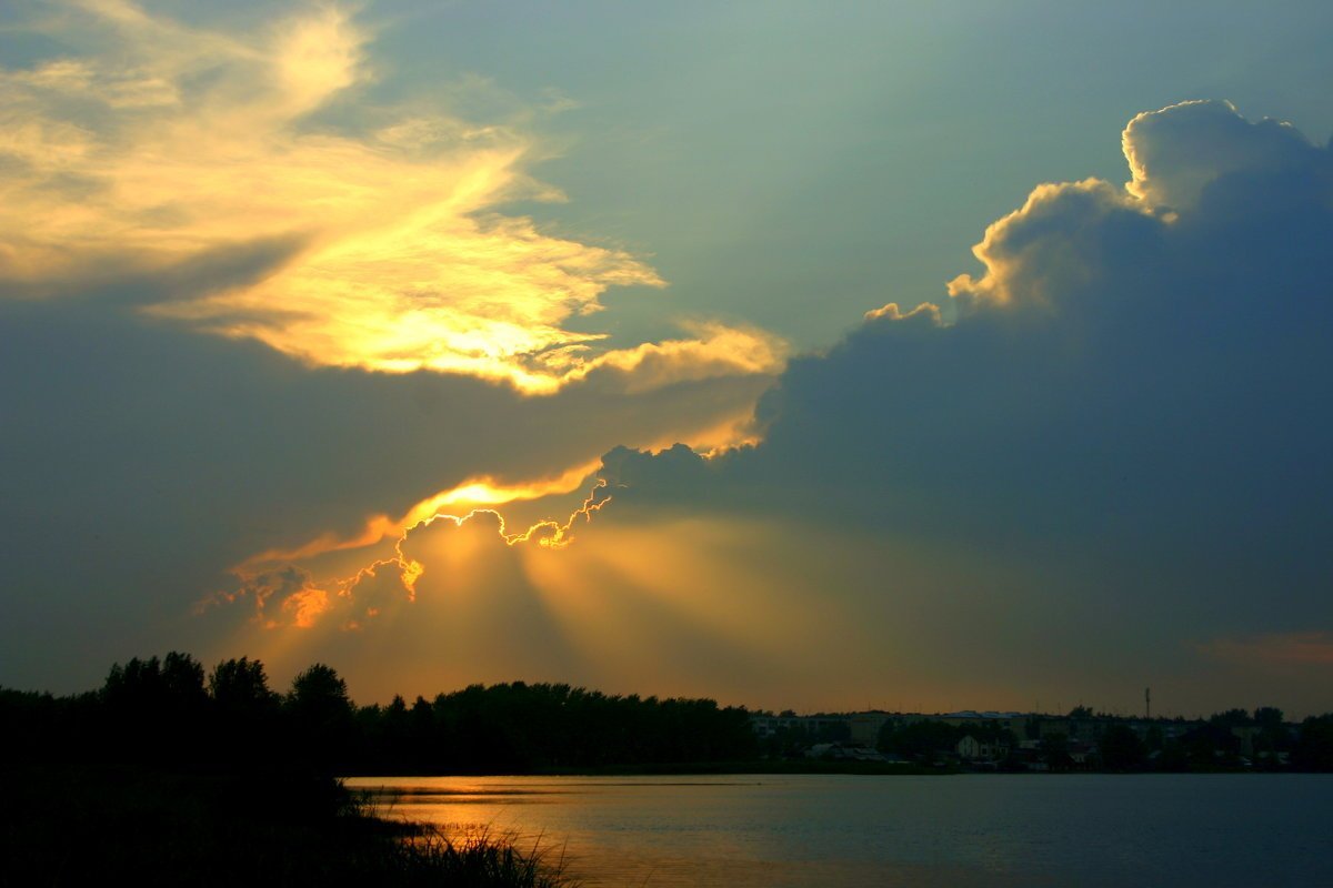 На картинке изображено великолепное солнце, медленно падающее за горизонт, окруженное пушистыми облаками. Яркие лучи проникают сквозь плотные облака, создавая игру света и тени на небесном холсте. Этот момент захватывает воображение зрителя и наполняет сердце умиротворением и восторгом перед величественной красотой заката. Вся сцена напоминает о проходящей красоте мира и природы, подчеркивая их уникальность и неповторимость.