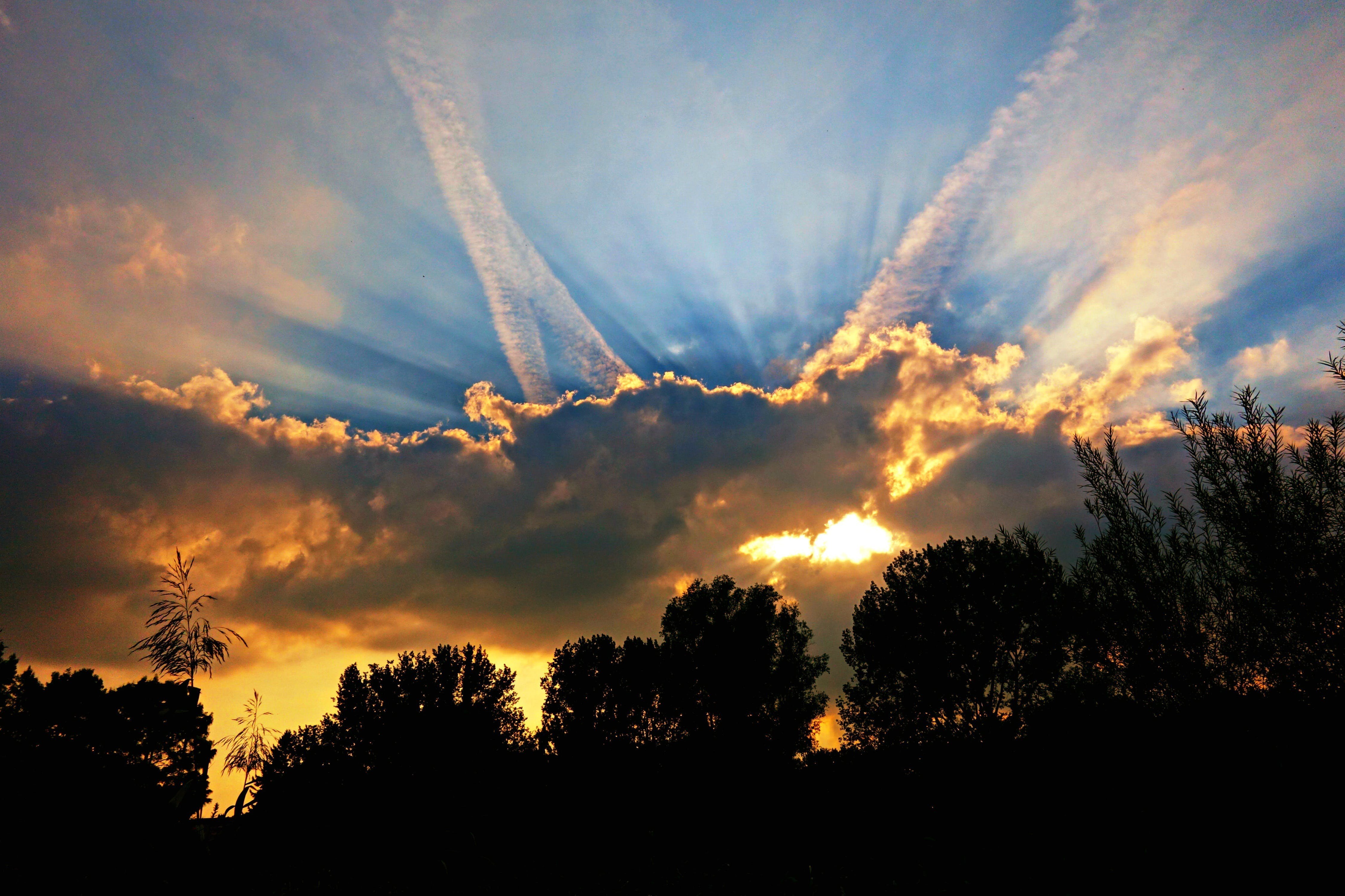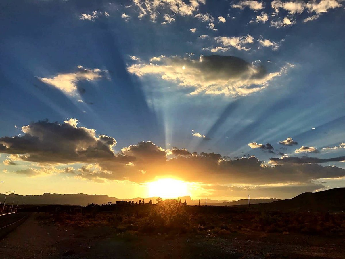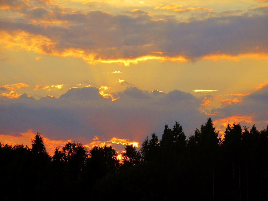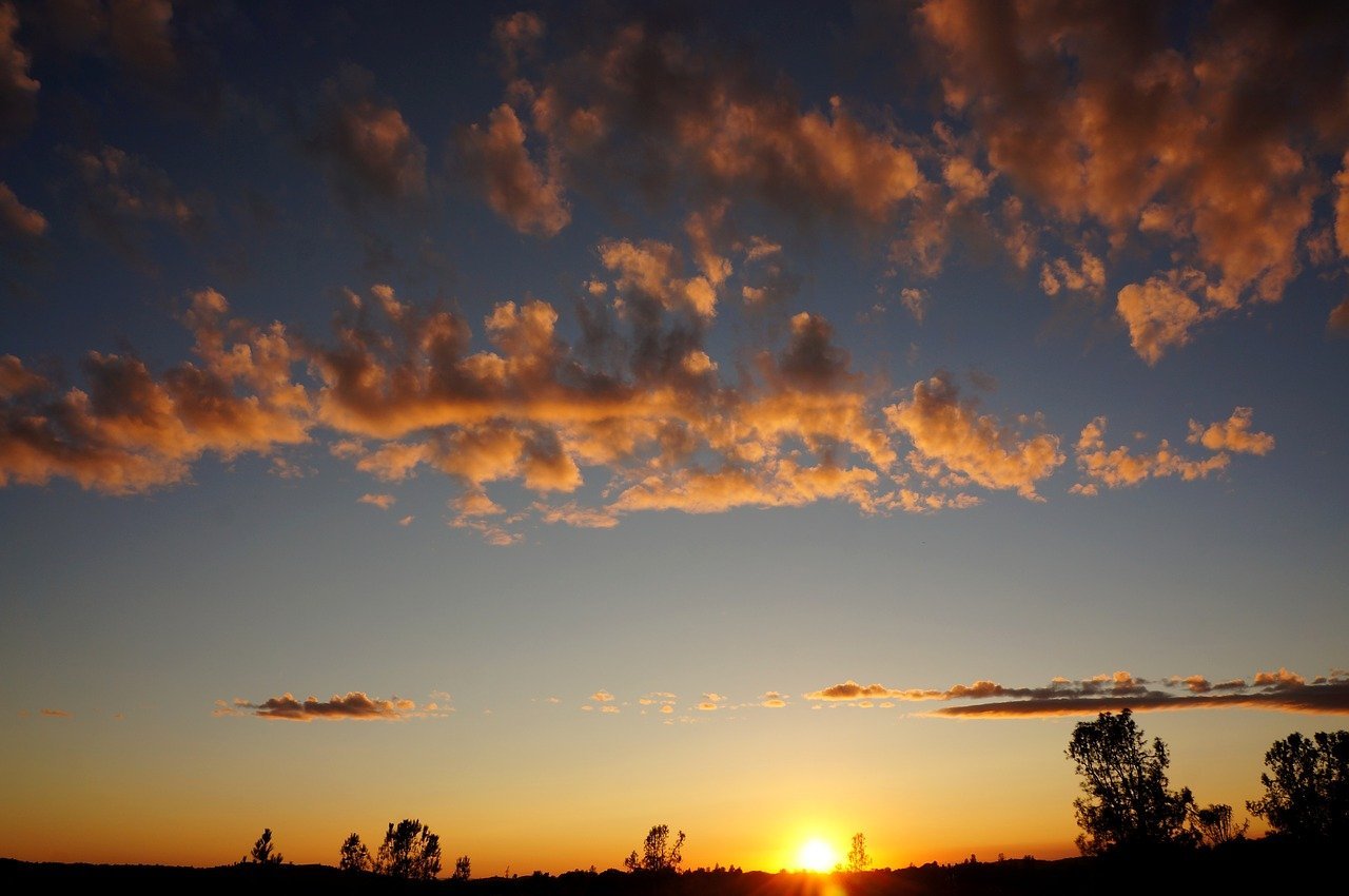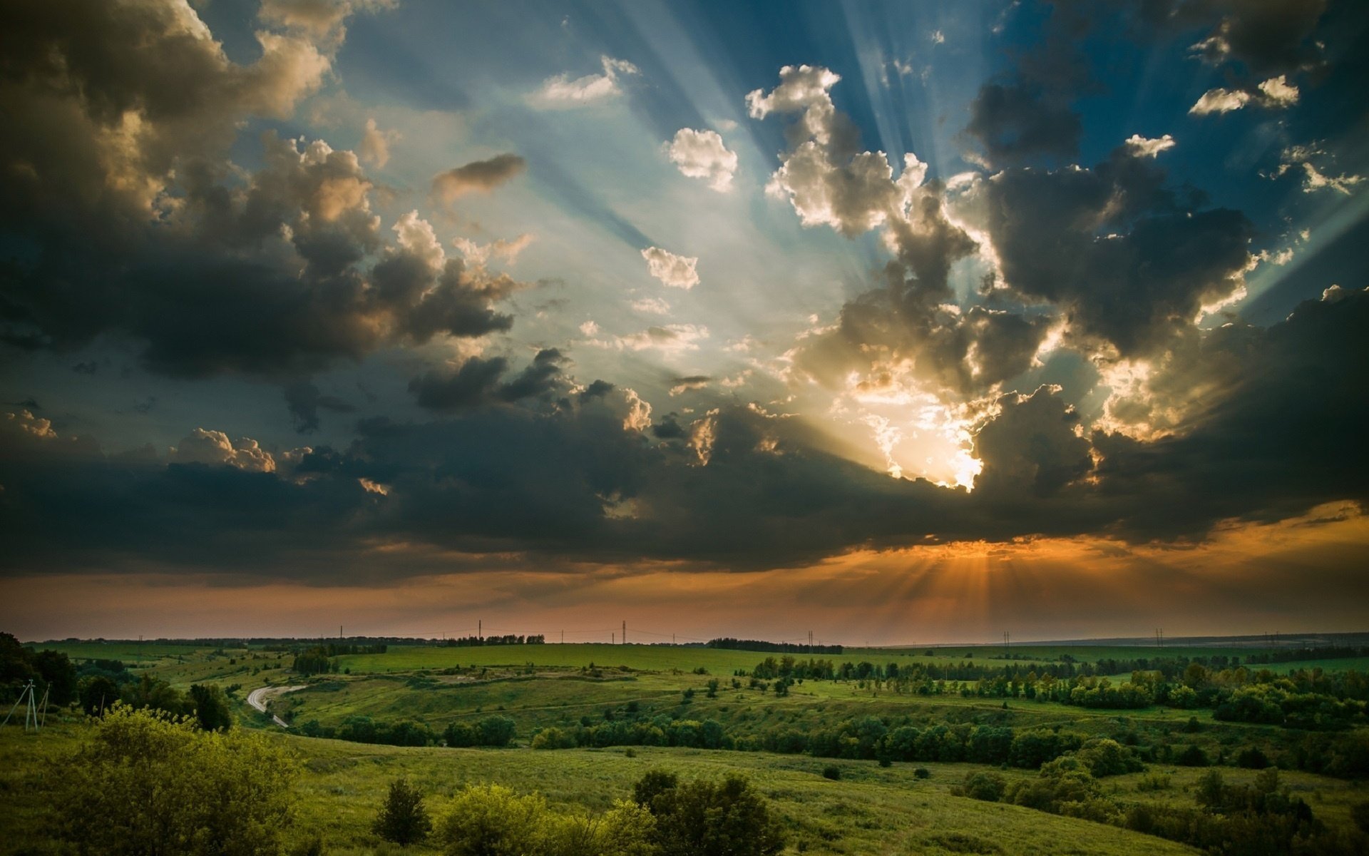 На картинке изображено великолепное солнце, медленно падающее за горизонт, окруженное пушистыми облаками. Яркие лучи проникают сквозь плотные облака, создавая игру света и тени на небесном холсте. Этот момент захватывает воображение зрителя и наполняет сердце умиротворением и восторгом перед величественной красотой заката. Вся сцена напоминает о проходящей красоте мира и природы, подчеркивая их уникальность и неповторимость.