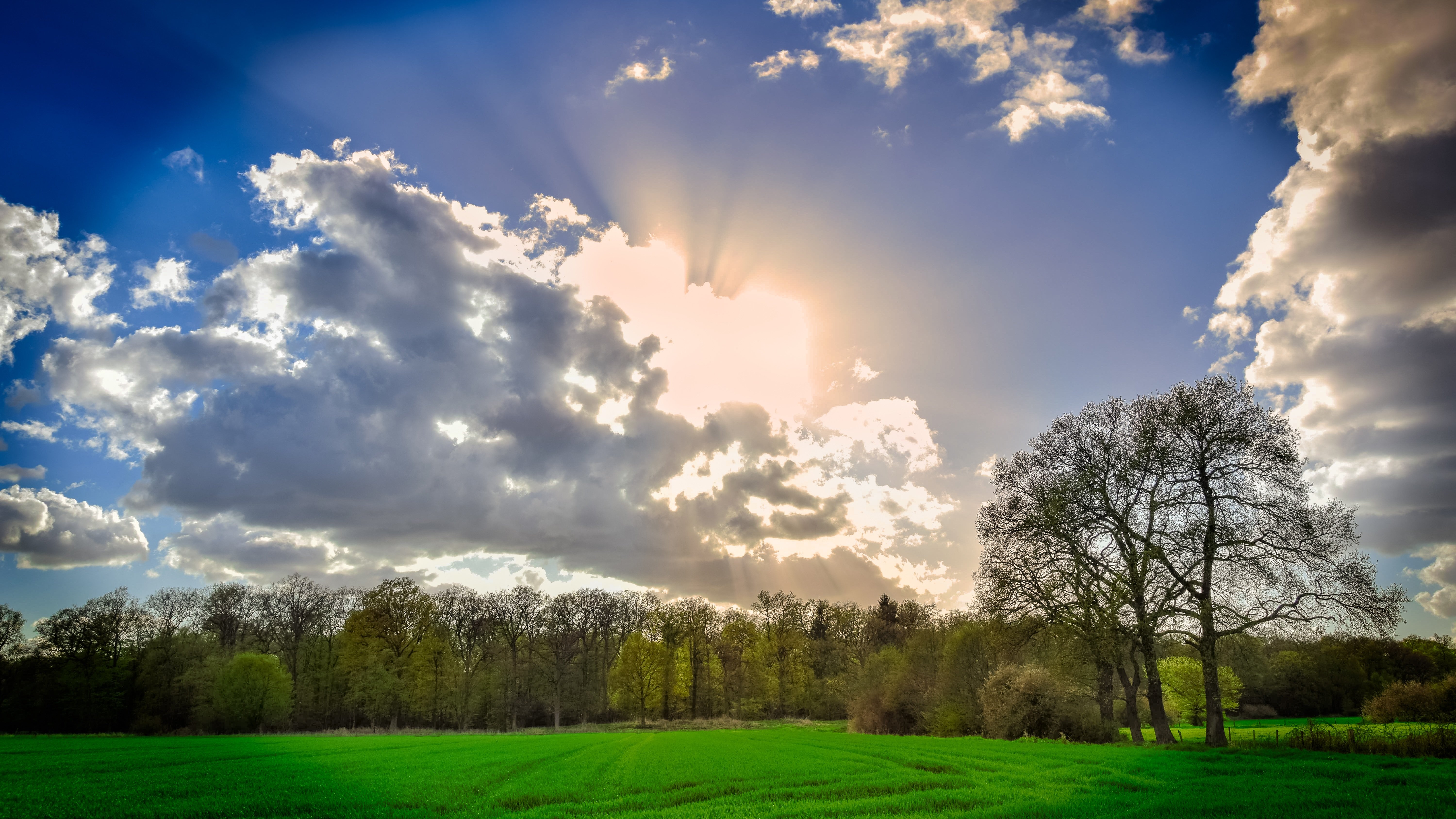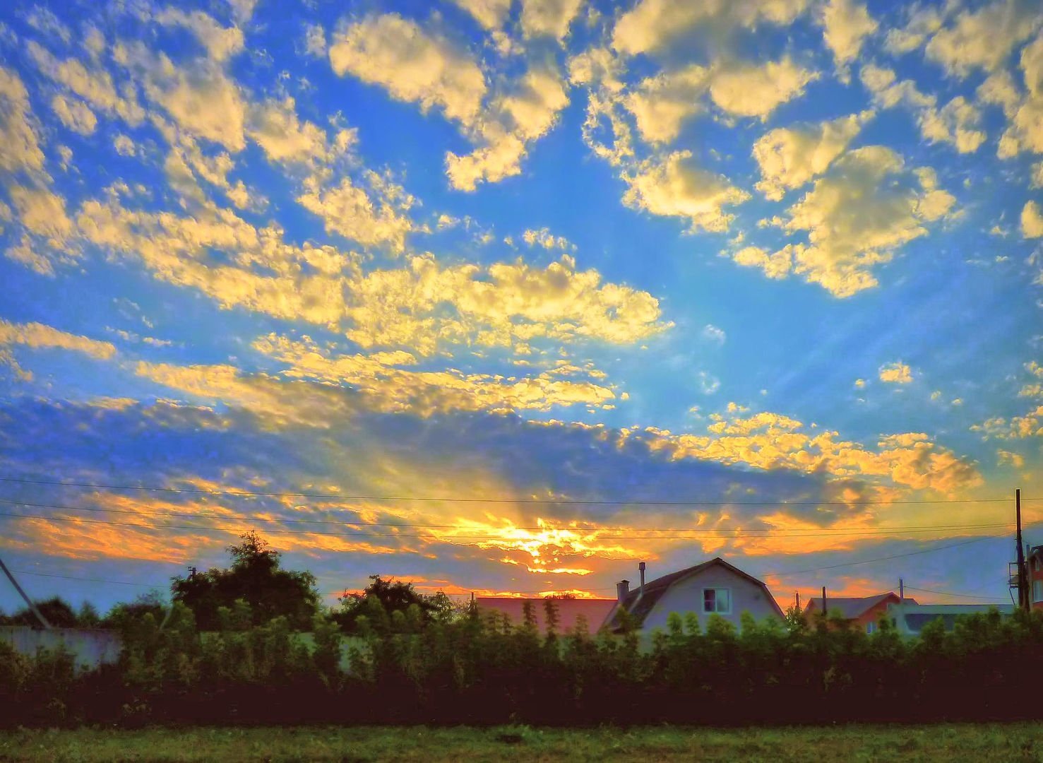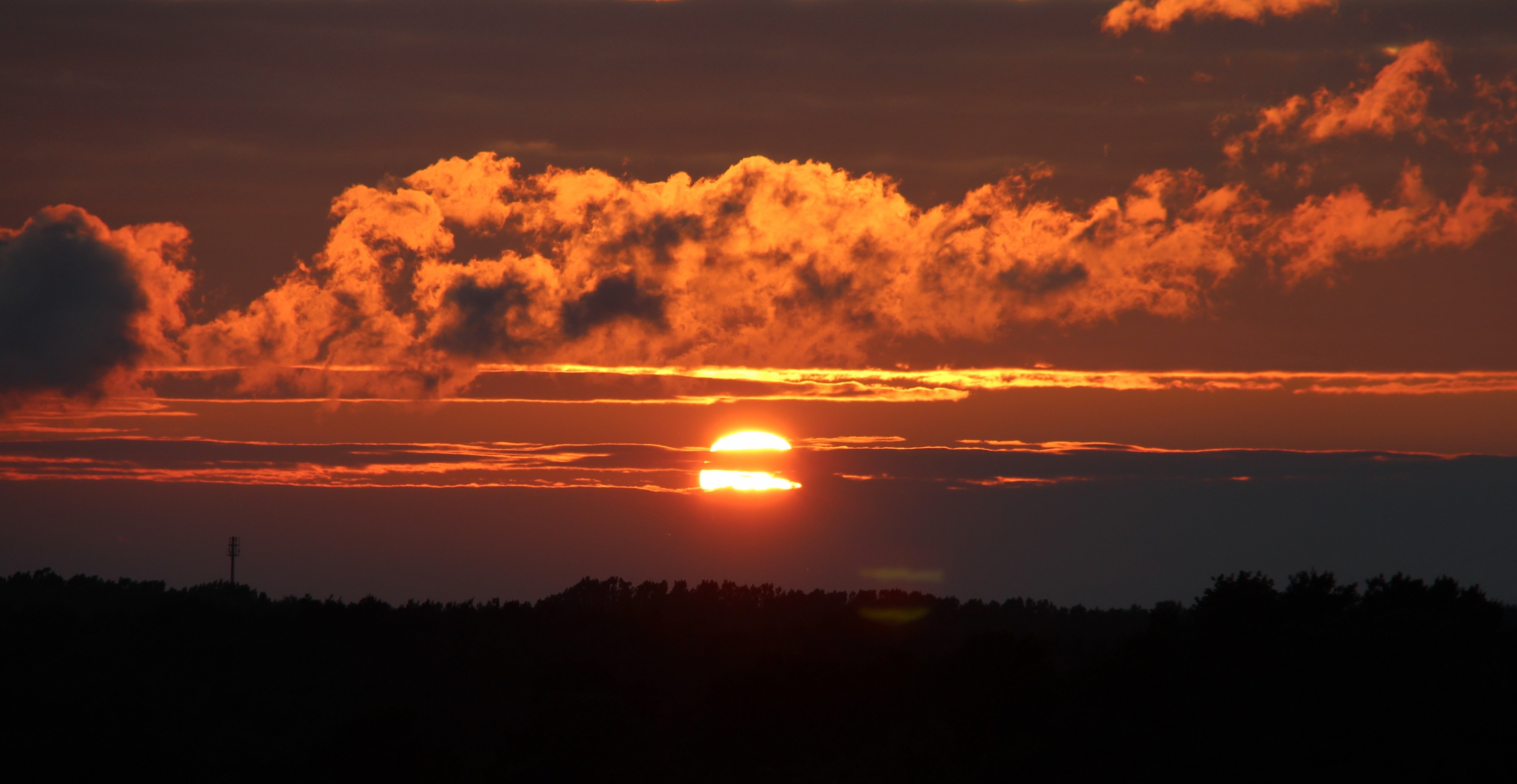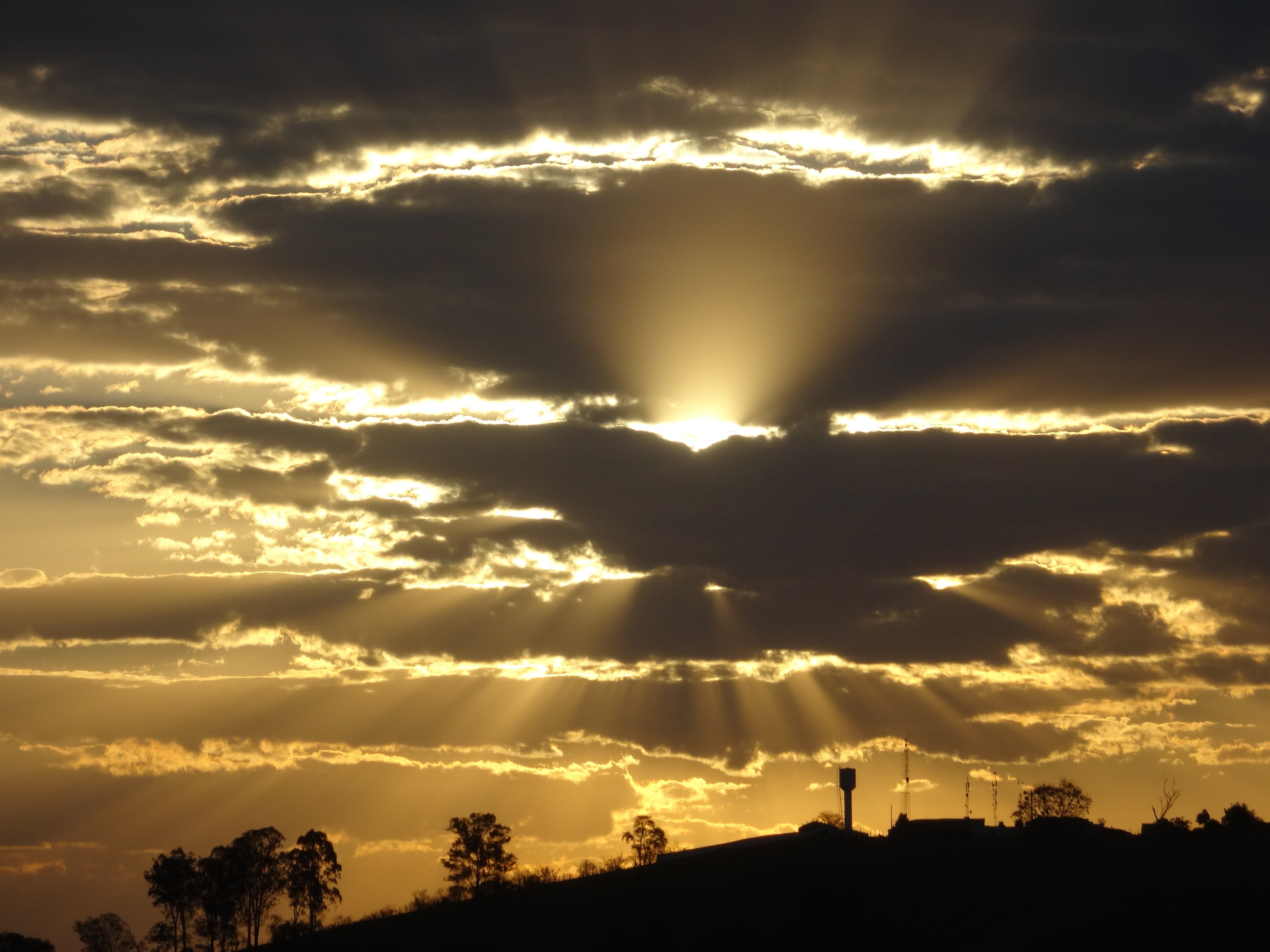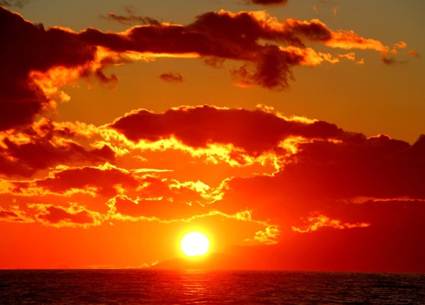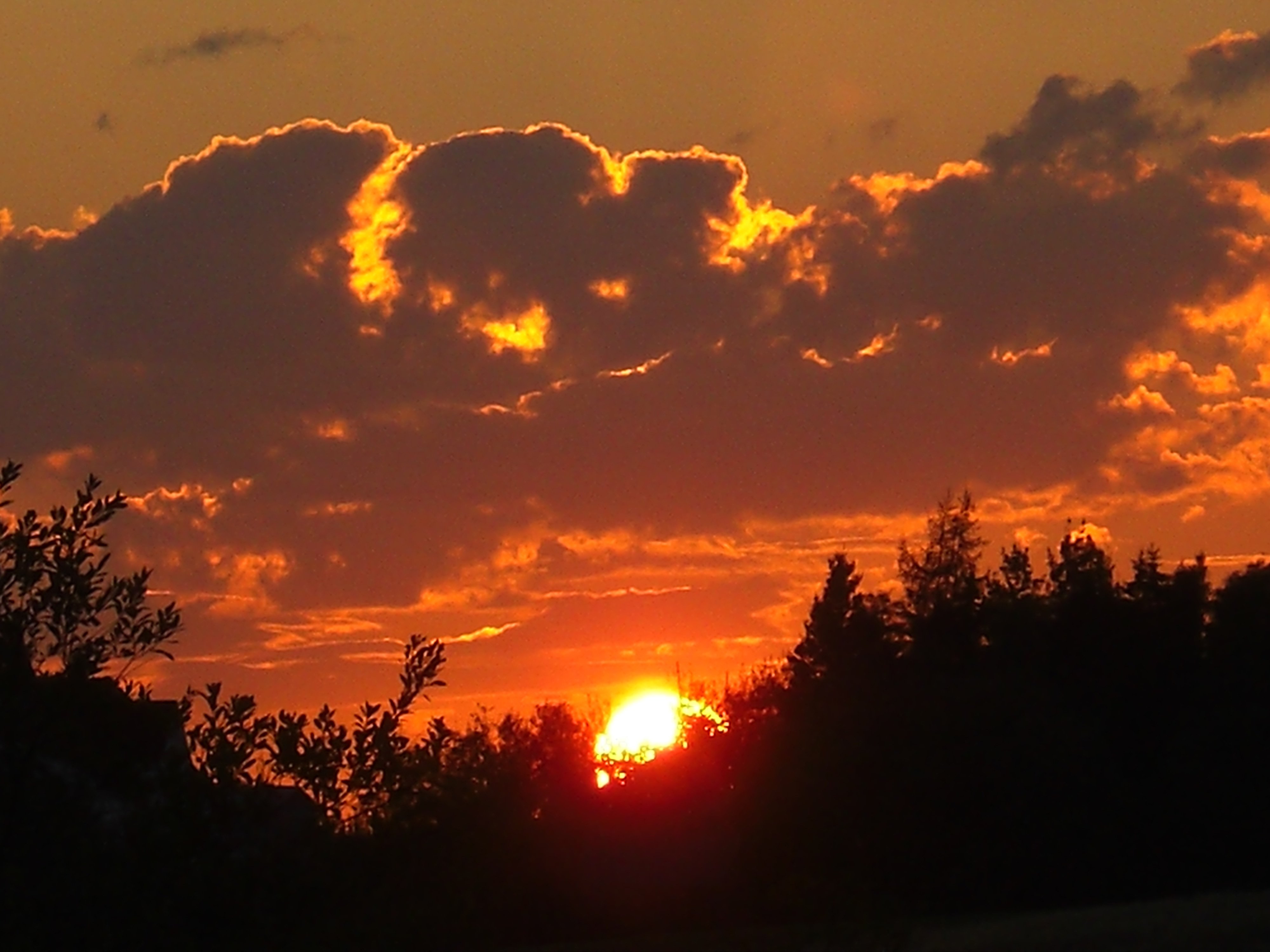 На картинке изображено великолепное солнце, медленно падающее за горизонт, окруженное пушистыми облаками. Яркие лучи проникают сквозь плотные облака, создавая игру света и тени на небесном холсте. Этот момент захватывает воображение зрителя и наполняет сердце умиротворением и восторгом перед величественной красотой заката. Вся сцена напоминает о проходящей красоте мира и природы, подчеркивая их уникальность и неповторимость.