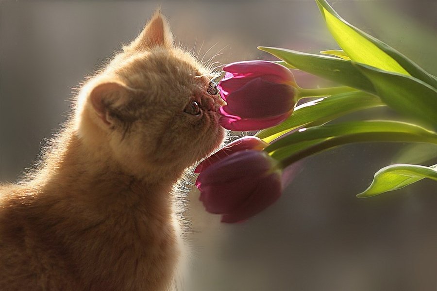 Кот с тюльпанами