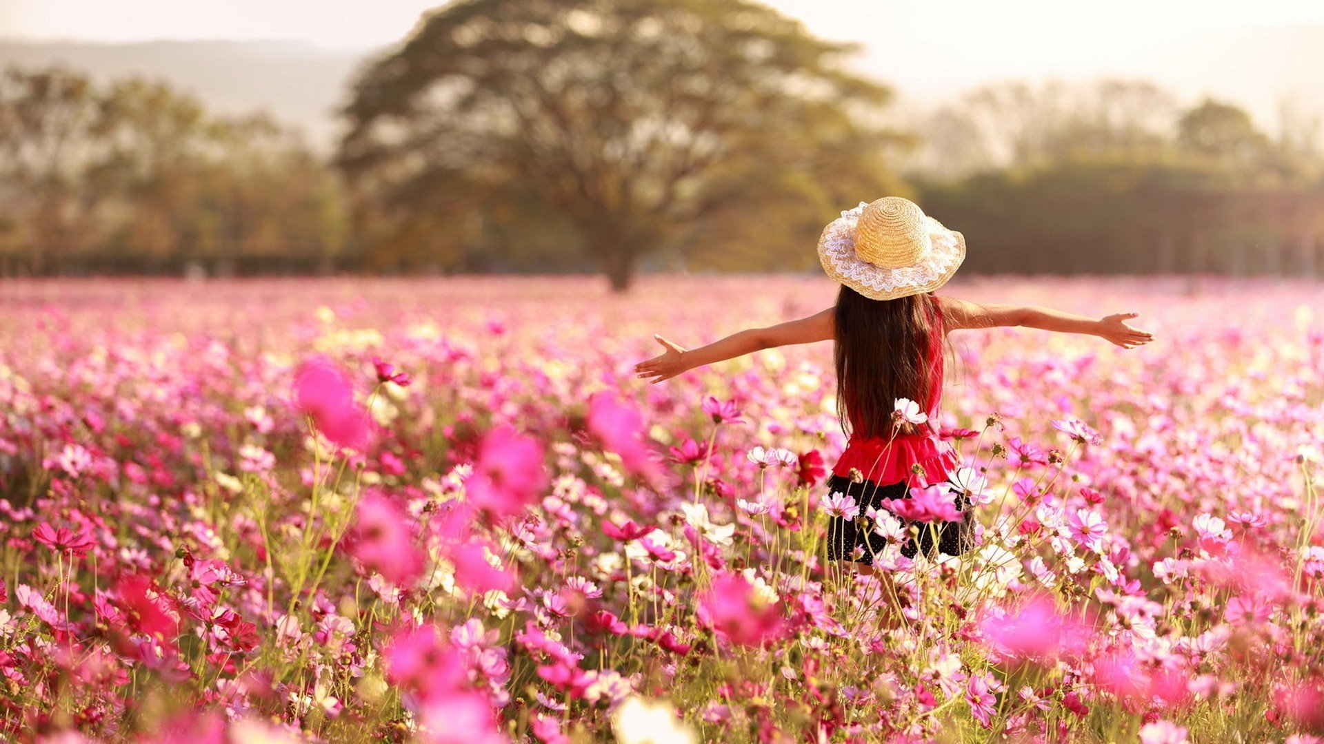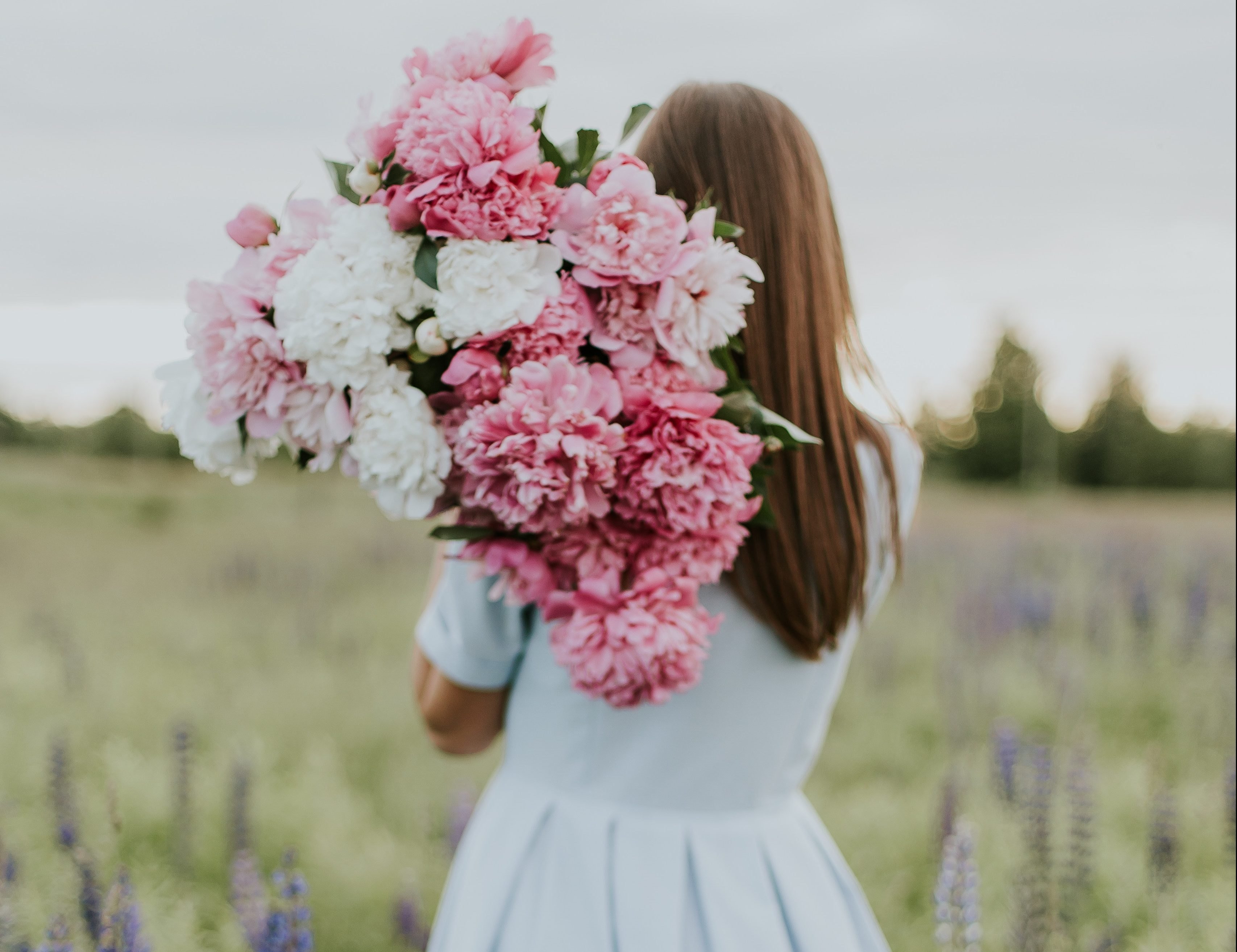 Девушка с цветами со спины