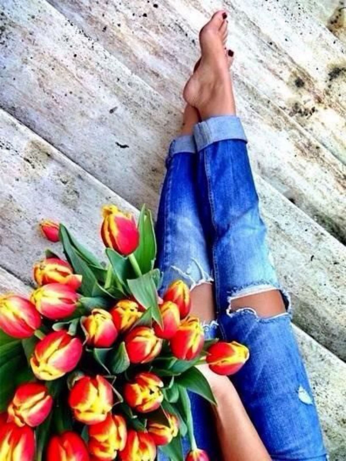 Фотосессия с тюльпанами в студии в джинсах