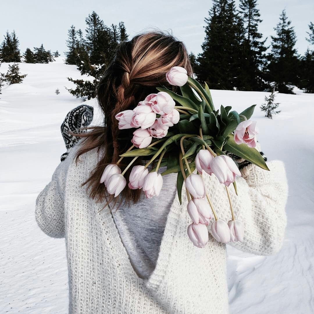 Девушка зимой с букетом цветов