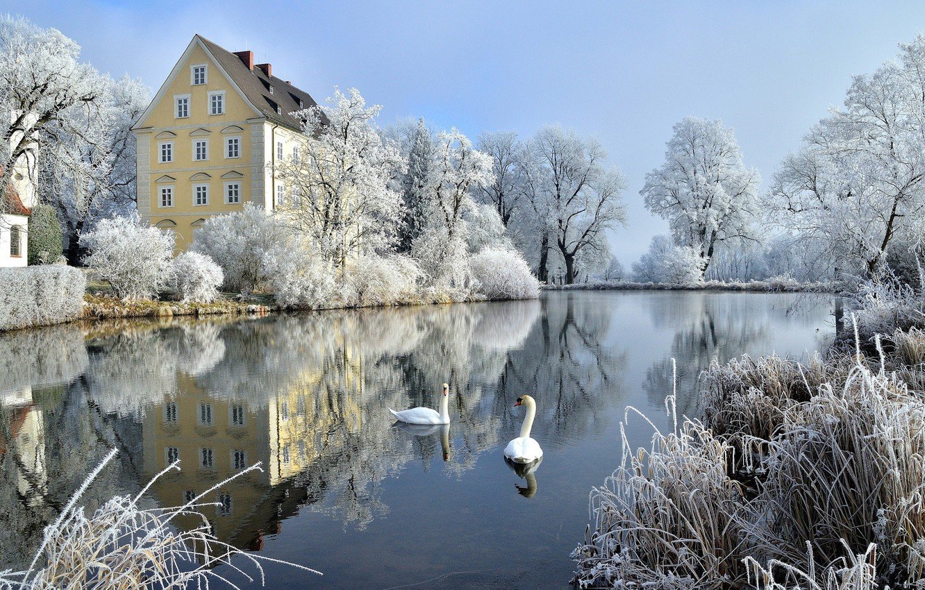 ![Домик у озера зимой]()
