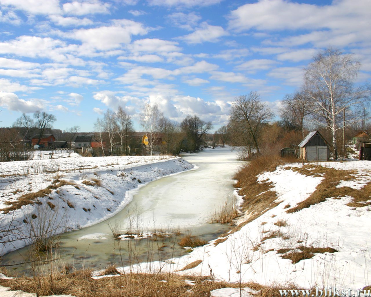 ![Зима деревня река]()