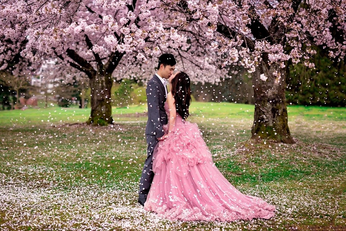 ![Пара в цветущем саду]()