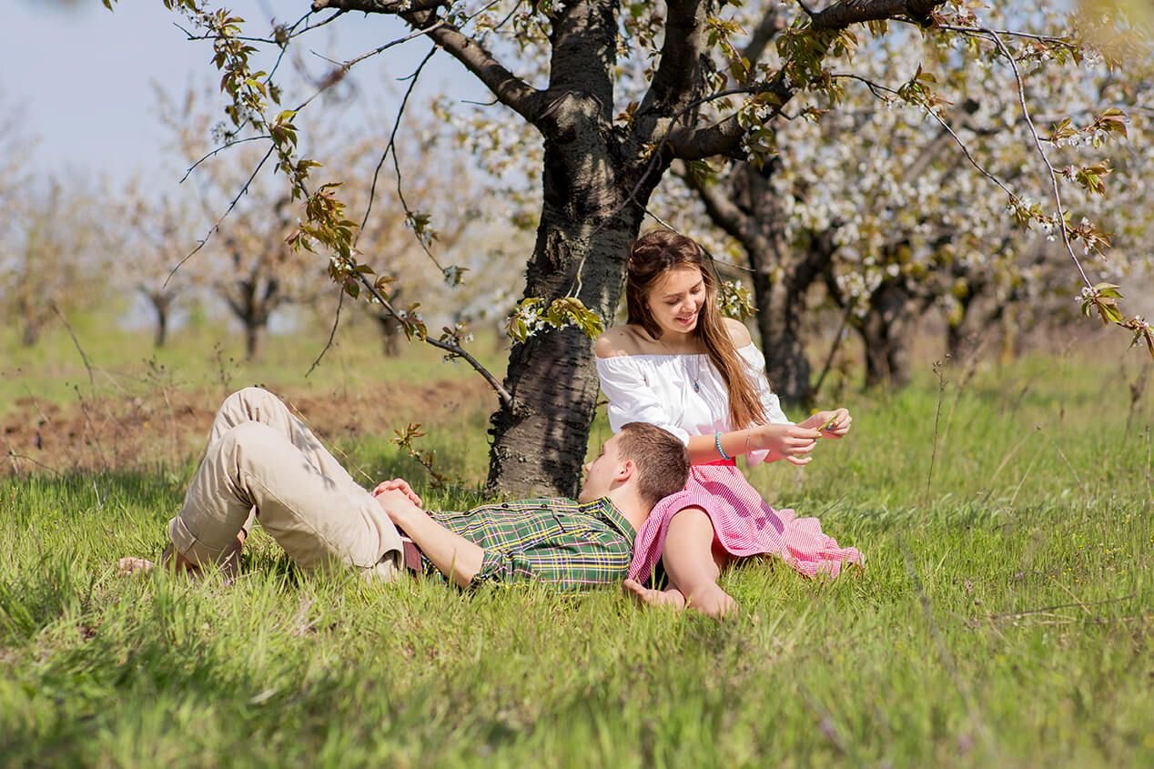 Парень и девушка в цветущем саду