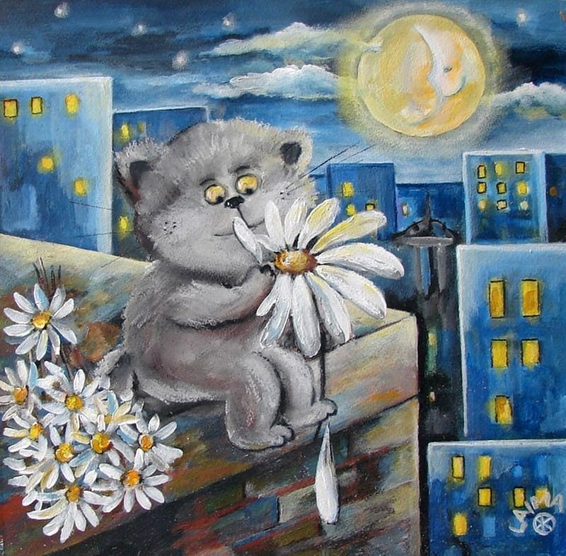Кот с ромашкой картина