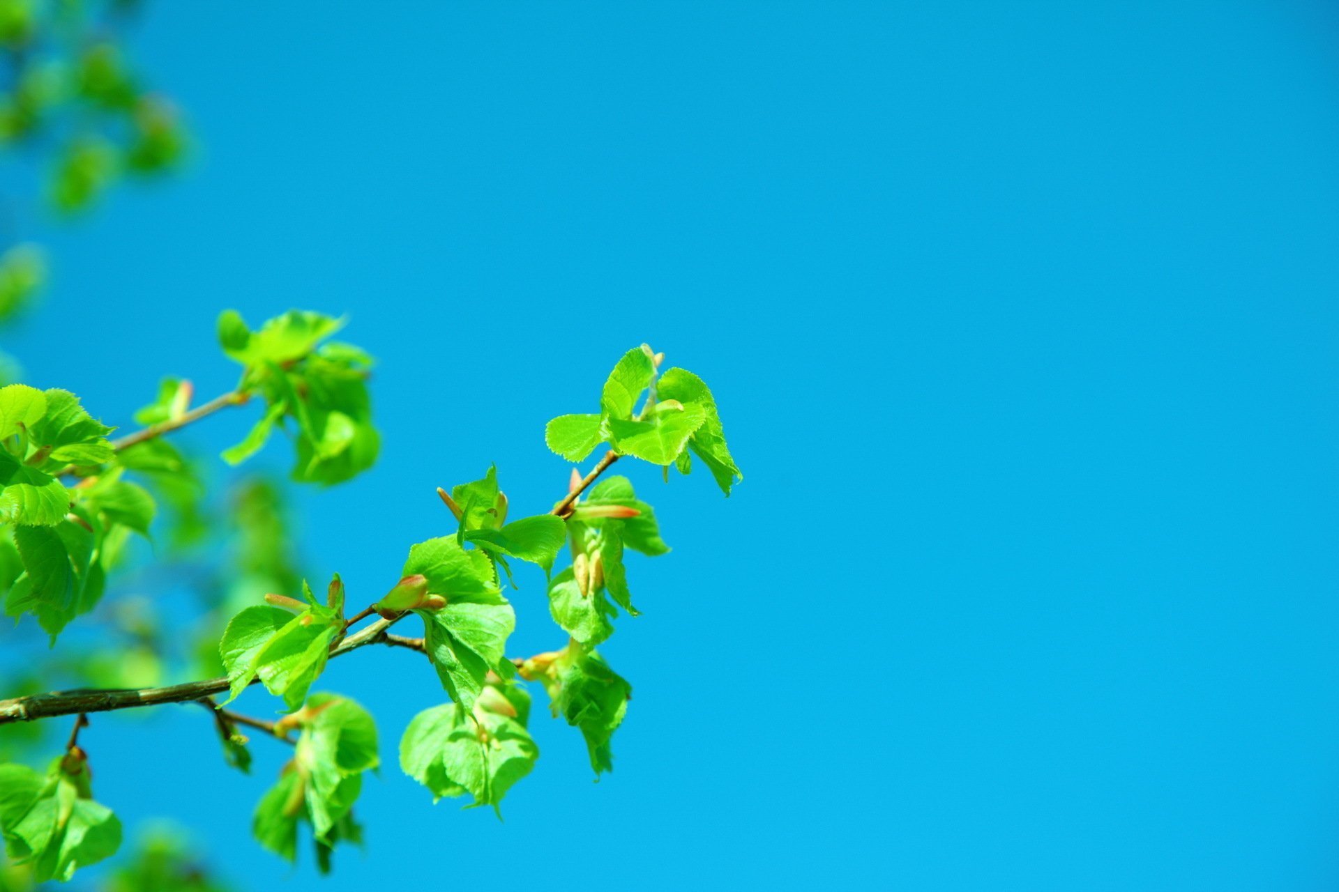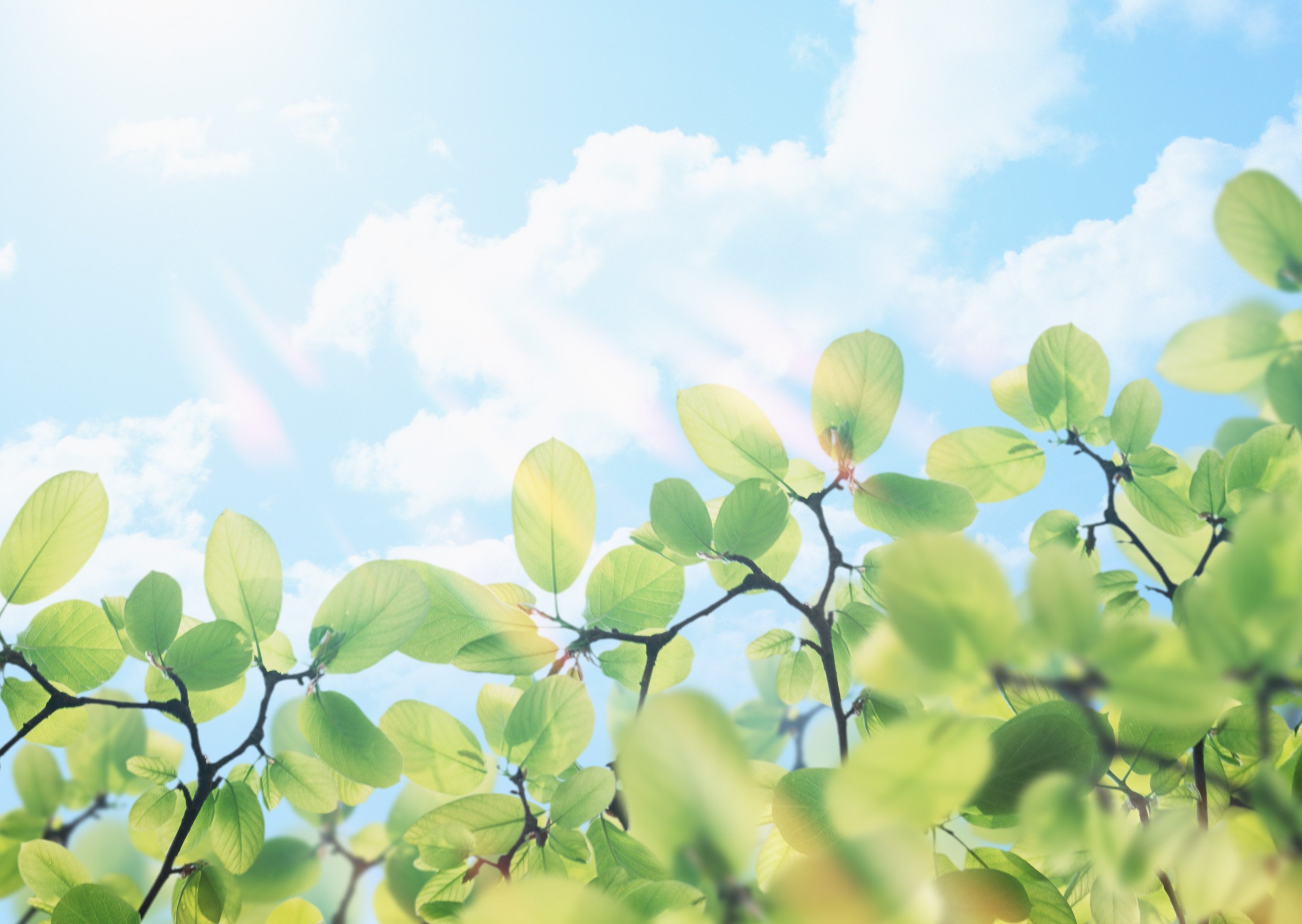 Зеленая листва на голубом небе