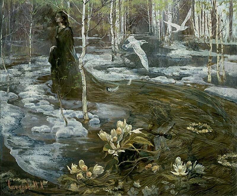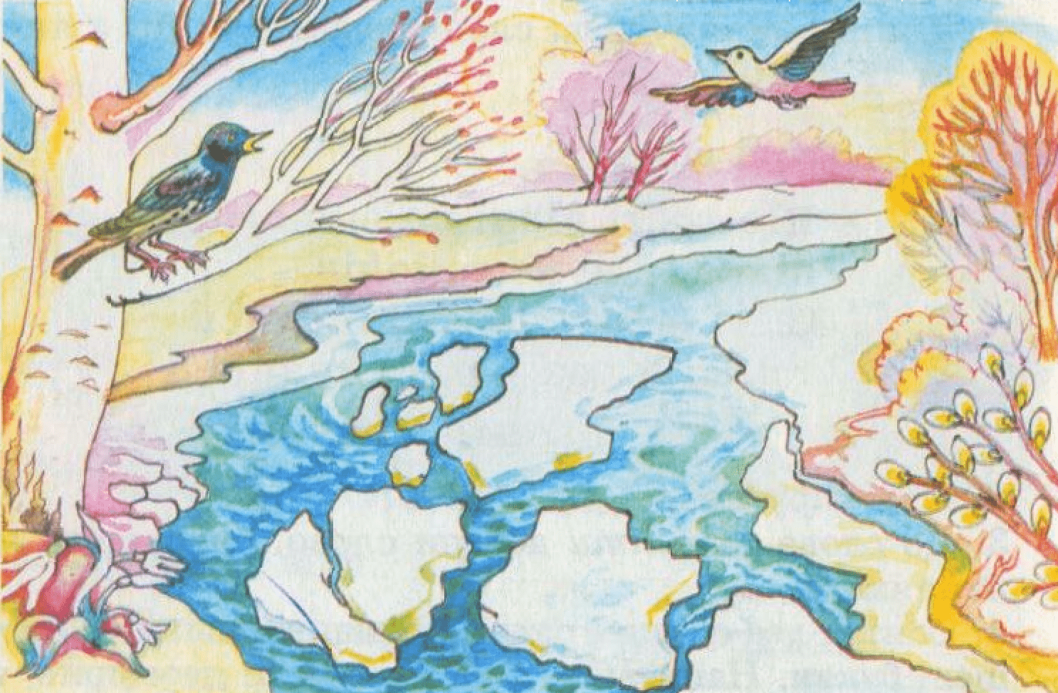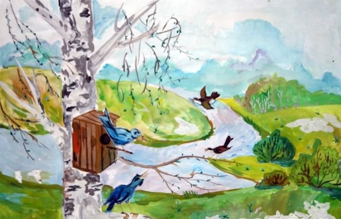 Картина "Приход весны" олицетворяет пробуждение природы после зимней спячки. На изображении можно увидеть яркие краски весенних цветов, распустившиеся почки на деревьях, лазурное небо и пушистые облака. Всё вокруг наполнено свежестью и легкостью, а солнечные лучи играют на светлой листве. Эта картина передаёт надежду, радость и обновление, символизируя переход от холодной зимы к теплому и яркому времени года.
