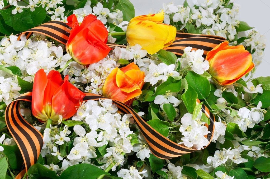![Цветы с георгиевской лентой]()