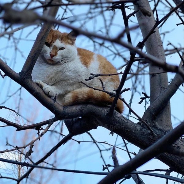 Кот на дереве весной
