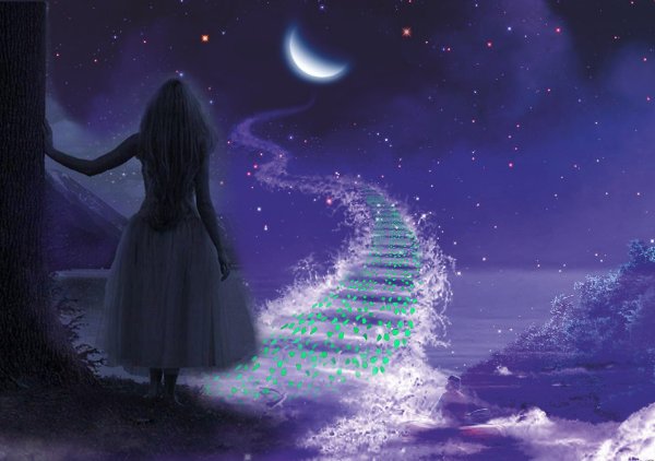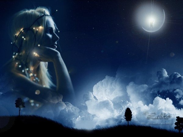 На фоне бескрайнего неба, усыпанного яркими звездами, величественно возвышается луна, светящая своим мистическим светом. Под этим небесным сводом грациозная девушка стоит, ее волосы развиваются на ветру, а взгляд наполнен загадочной тайной. Этот образ словно вырван из сновидений, где реальность переплетается с фантазией, создавая волшебную картину, полную загадок и красоты.